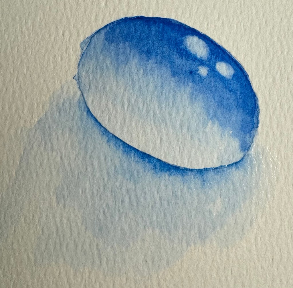 Added in shadows and also added in highlights to the surface of the droplet, which was a mistake because the paint was still wet.